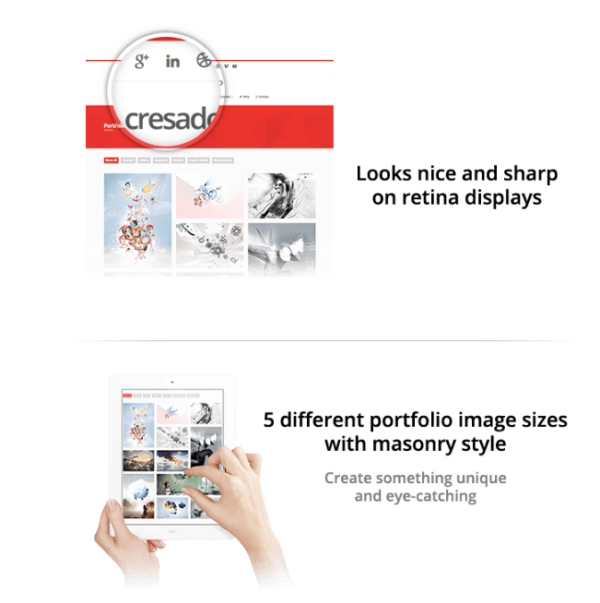 Cresado is responsive and retina ready theme for portfolio sites and creative agencies. Powerful options panel gives you a lot of possibilities to edit your theme easily. Over 40 color pickers will help you with creating your own color style. You can also give some personality to your pages thanks to custom title options. Theme looks great on tablets and mobile phones.