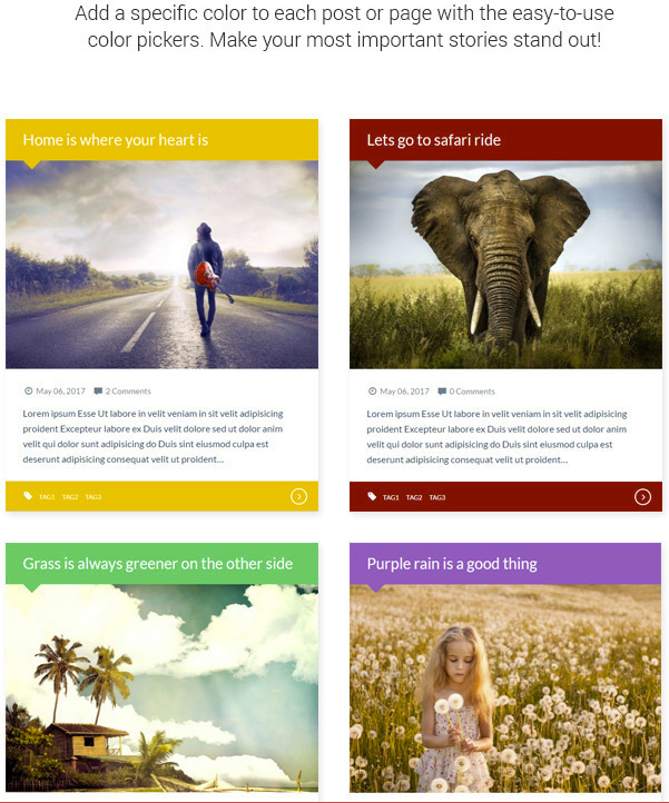 - Custom Colors For Posts and Pages – Add a specific color to each post or page with the easy-to-use color pickers. Make your most important stories stand out.