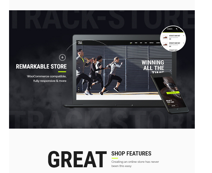 Welcome to TrackStore, a place where sport has a special place. This urban, sportsware shop theme has everything you may need to create a modern sports shop with ease. TrackStore comes with a powerful features including quick view pop-up, order tracking functionality, full width dropdown cart, product carousel and sliders, user log-in and much more. Sell gym equipment or sports clothes like a pro, with TrackStore’s options and product layouts. Never miss out the chance to amaze sport lovers with your stunning website. Start with TrackStore.