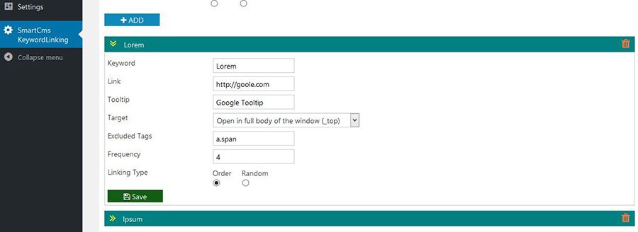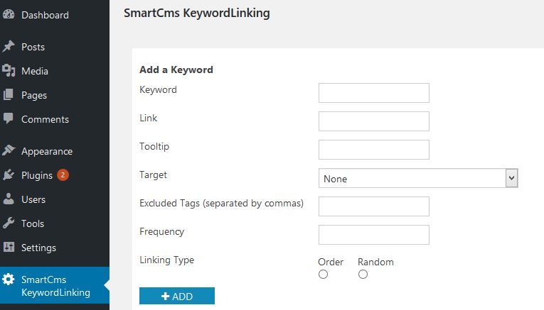 Plugin allows you to create and manage keywords, the keyword data will including Keyword, Link URL, Tooltip, Target, Excluded Tags, keyword frequency will be linked and type of links (order or random).